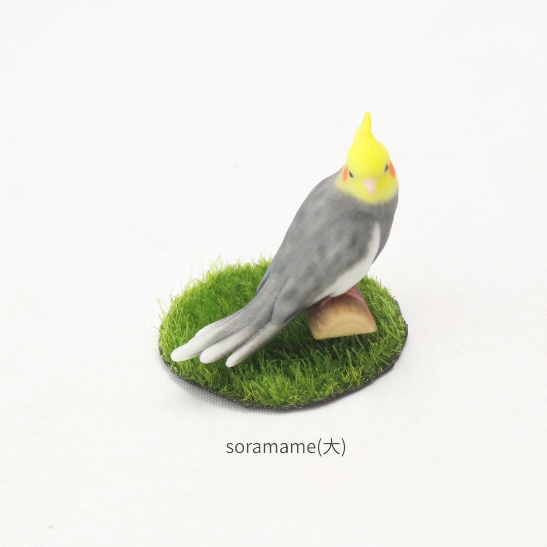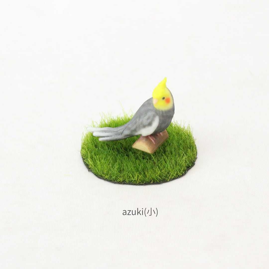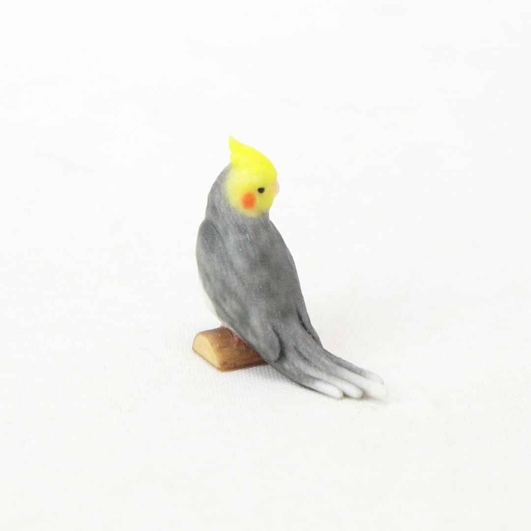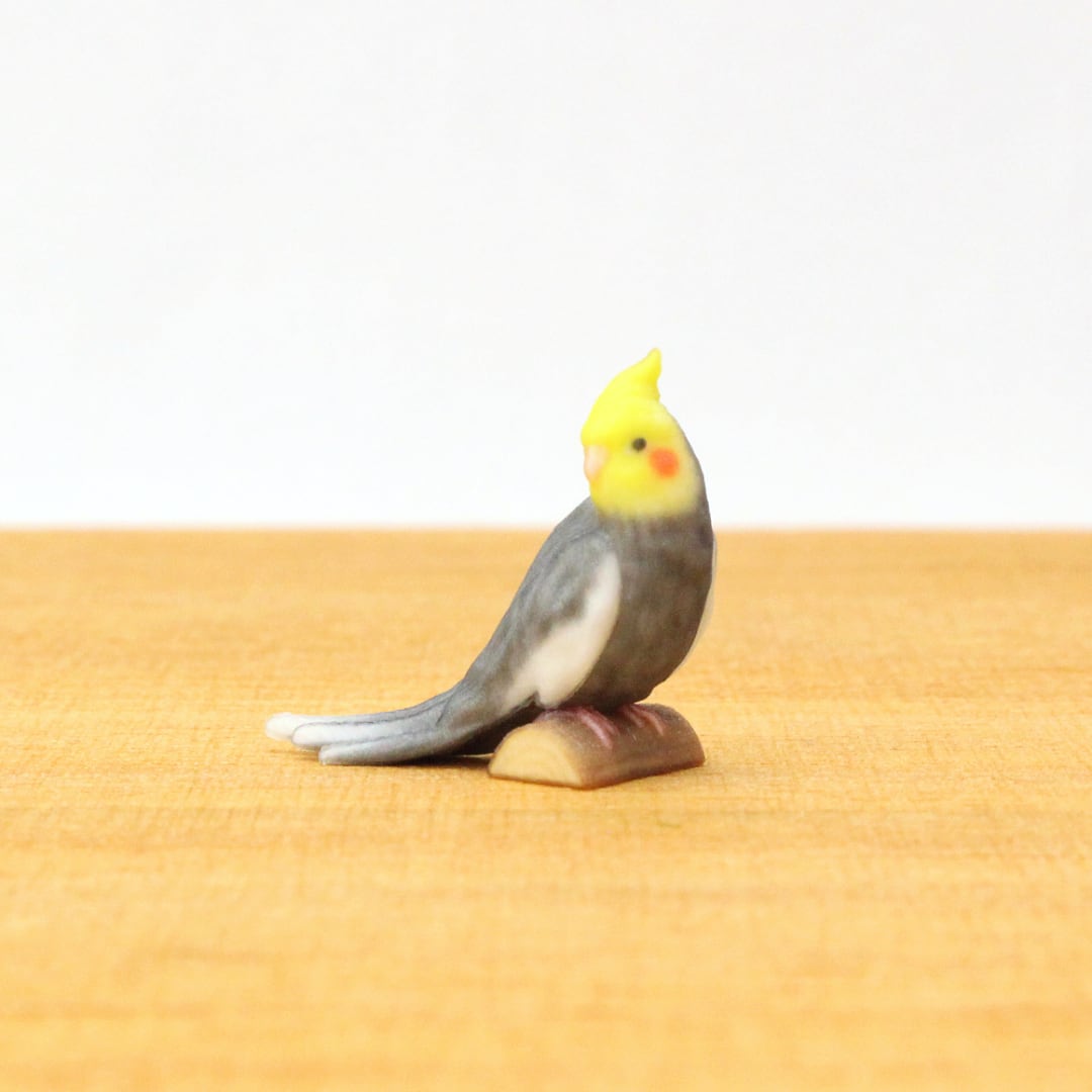 鳥の中でもひときわ寂しがりやで愛情深いオカメインコの、リラックスしながらも周囲をそっと伺う愛らしい姿をミニチュアに再現しました。