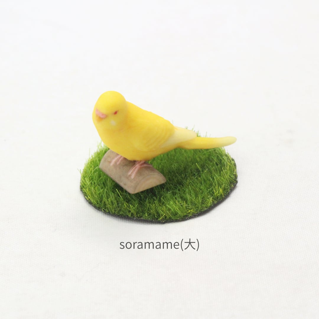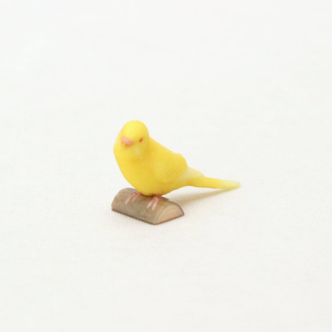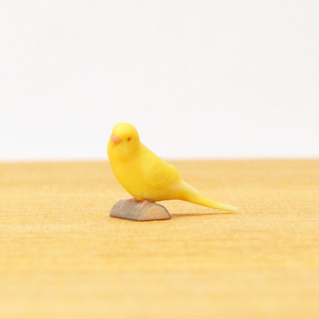 世界中で愛されるセキセイインコが、好奇心いっぱいに首をかしげて周囲を観察する愛らしい姿をミニチュアに再現しました。