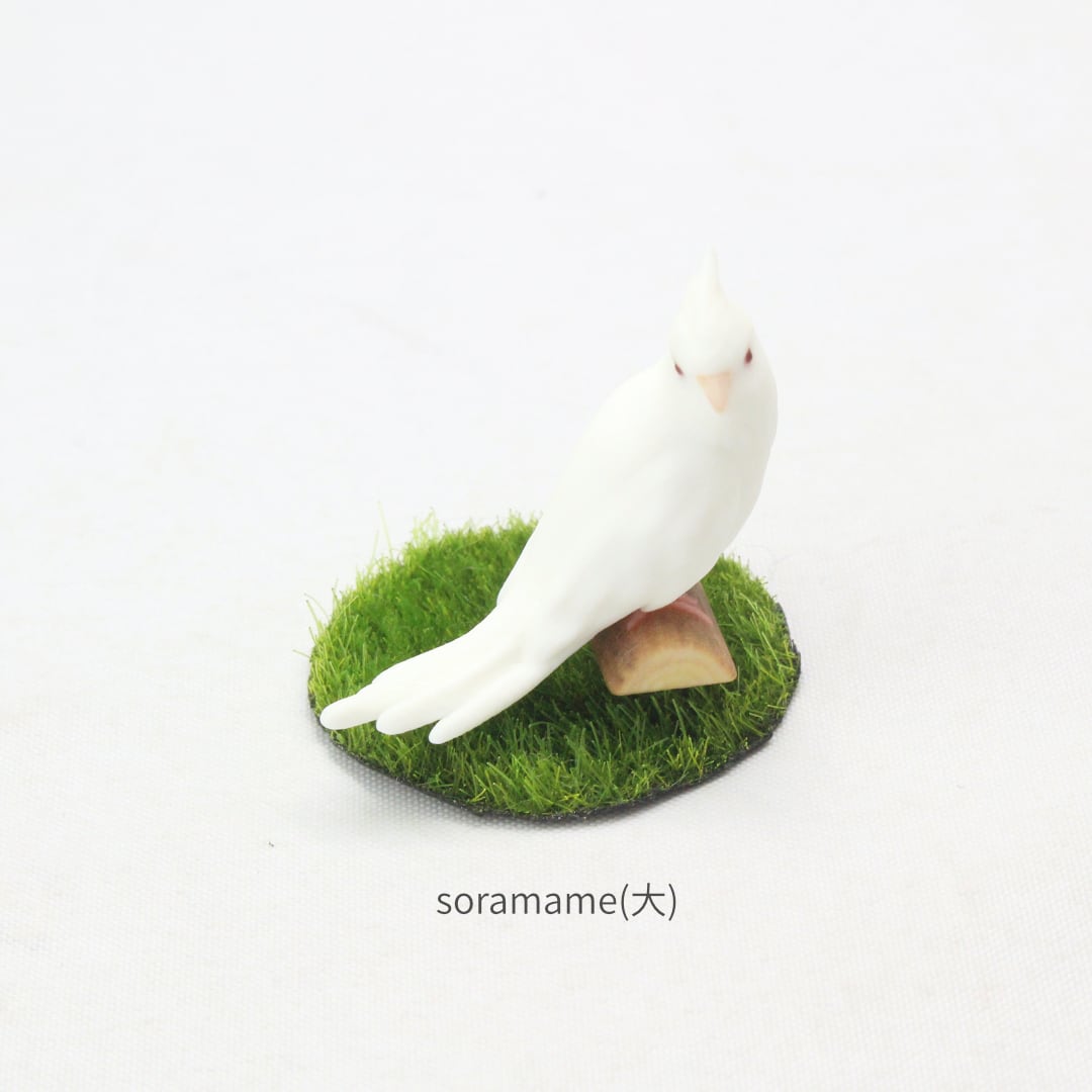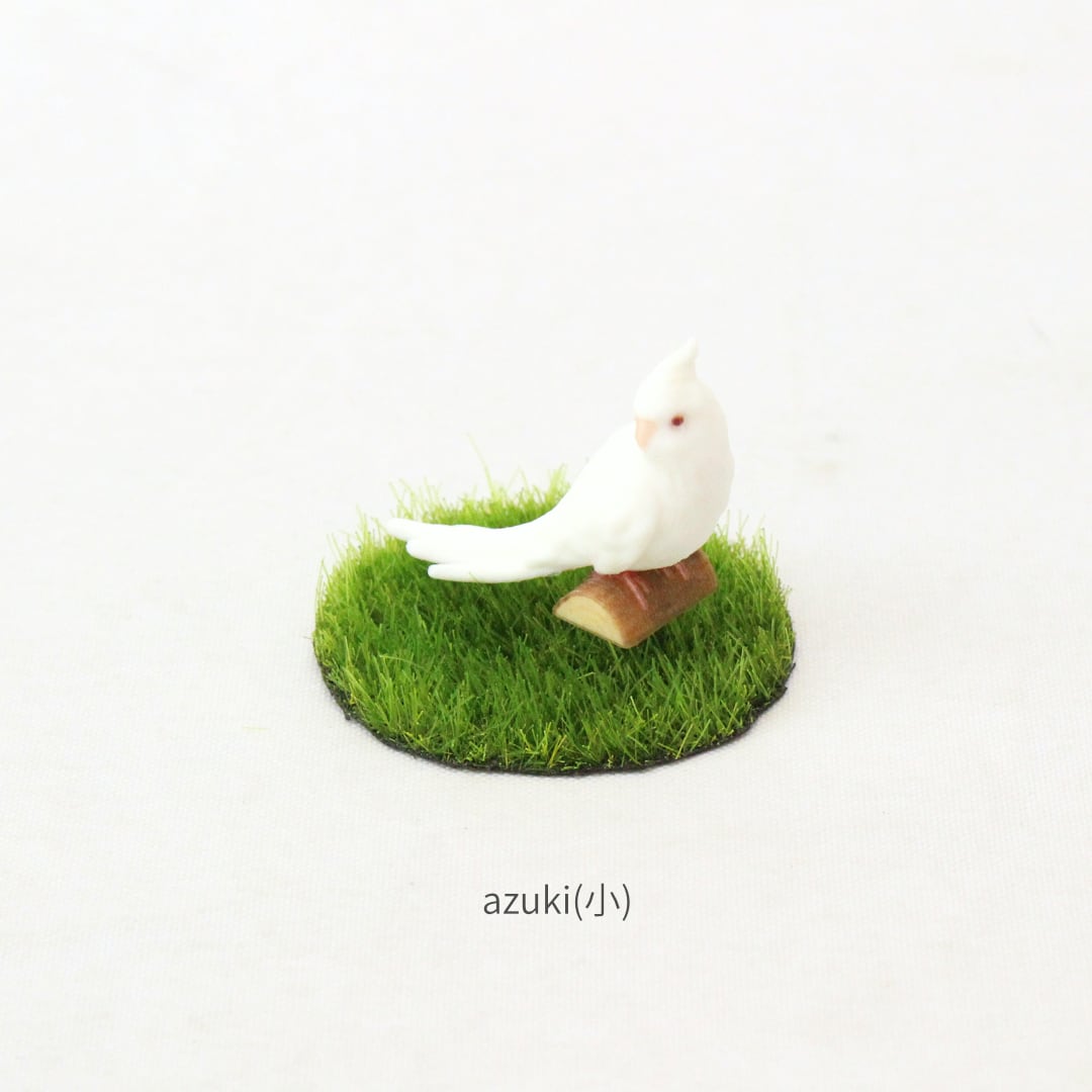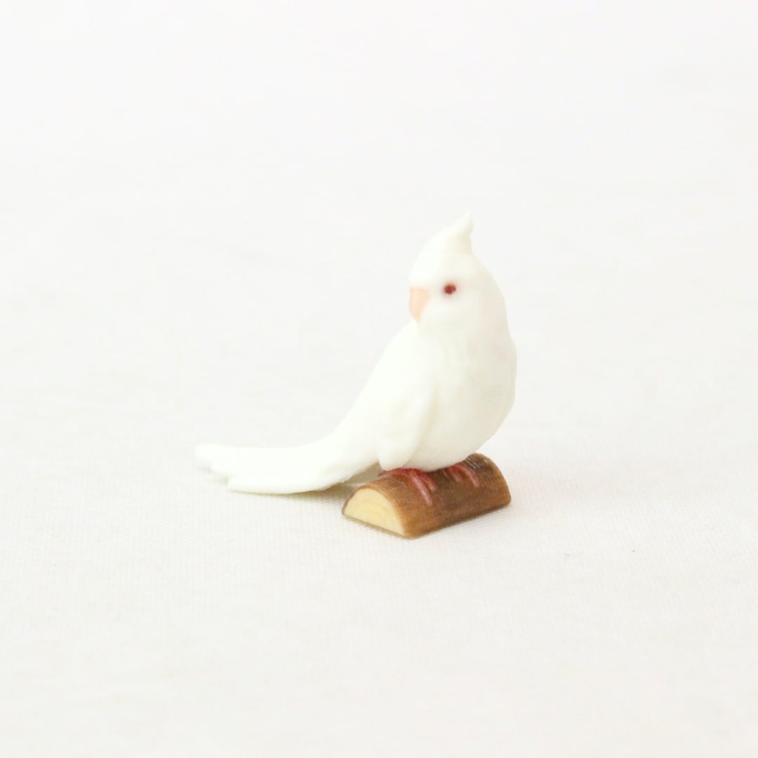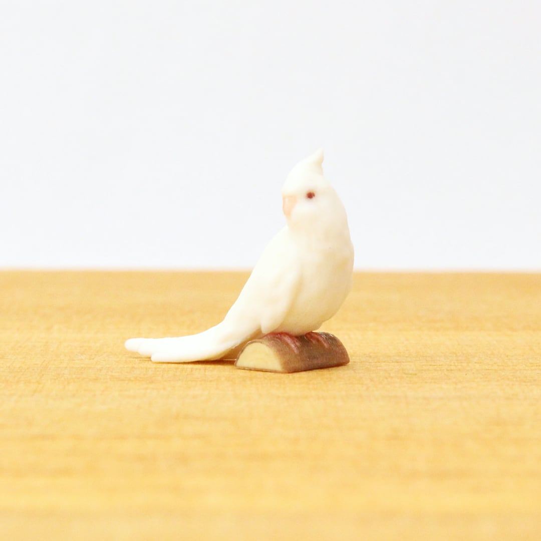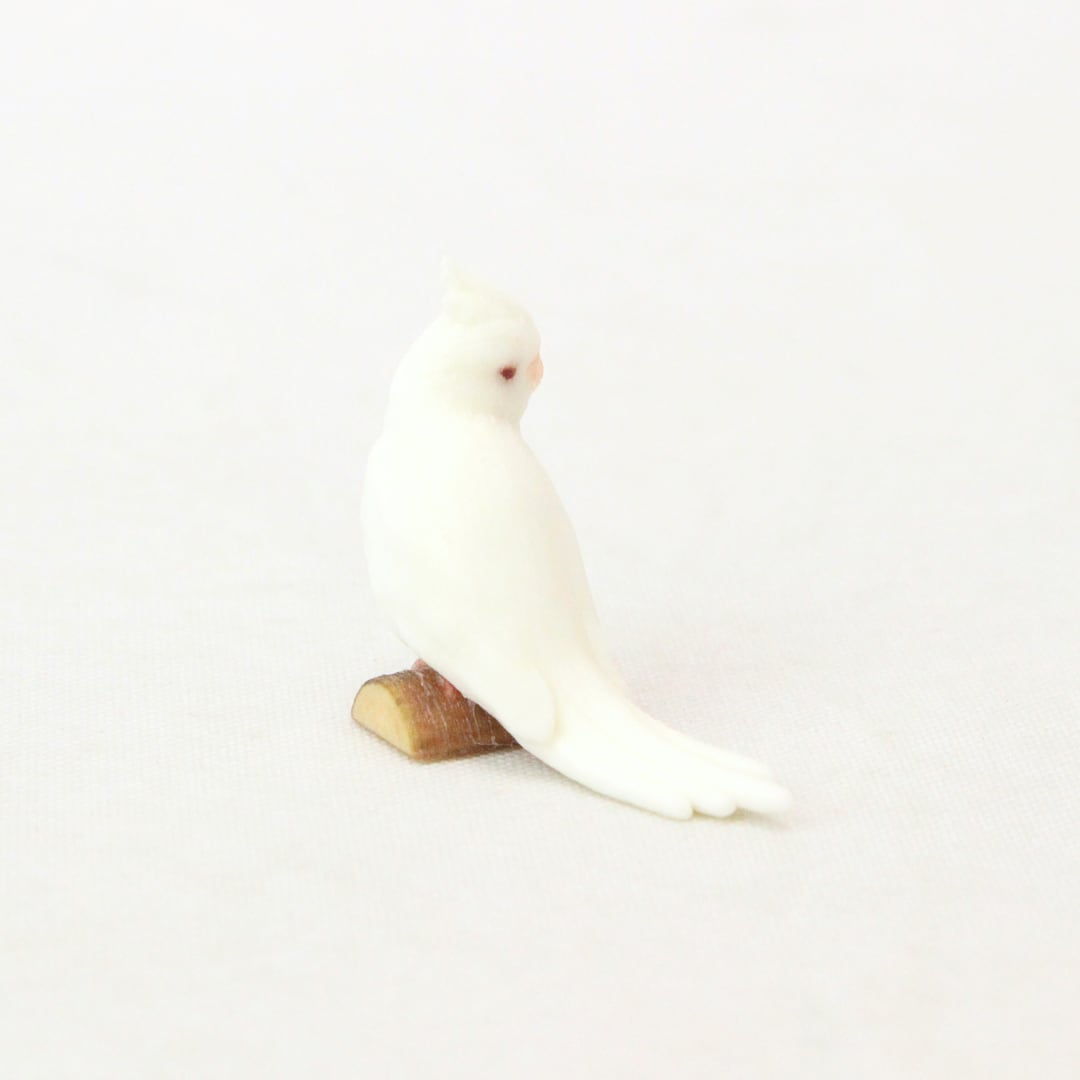 鳥の中でもひときわ寂しがりやで愛情深いオカメインコの、リラックスしながらも周囲をそっと伺う愛らしい姿をミニチュアに再現しました。