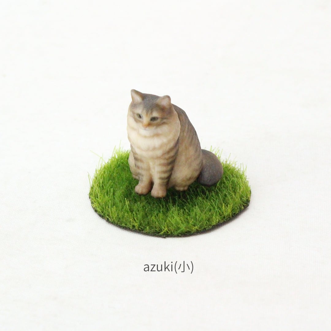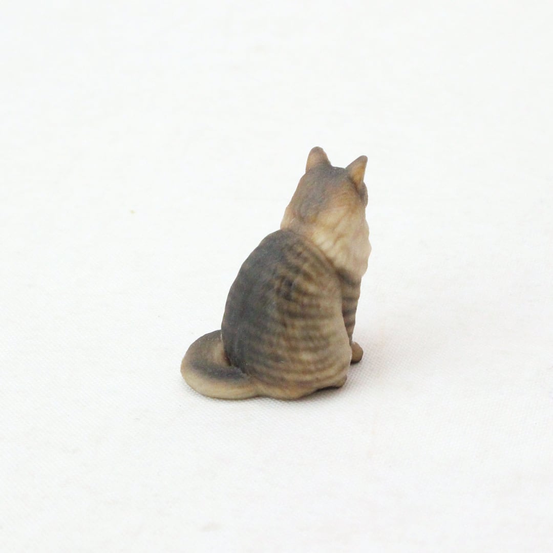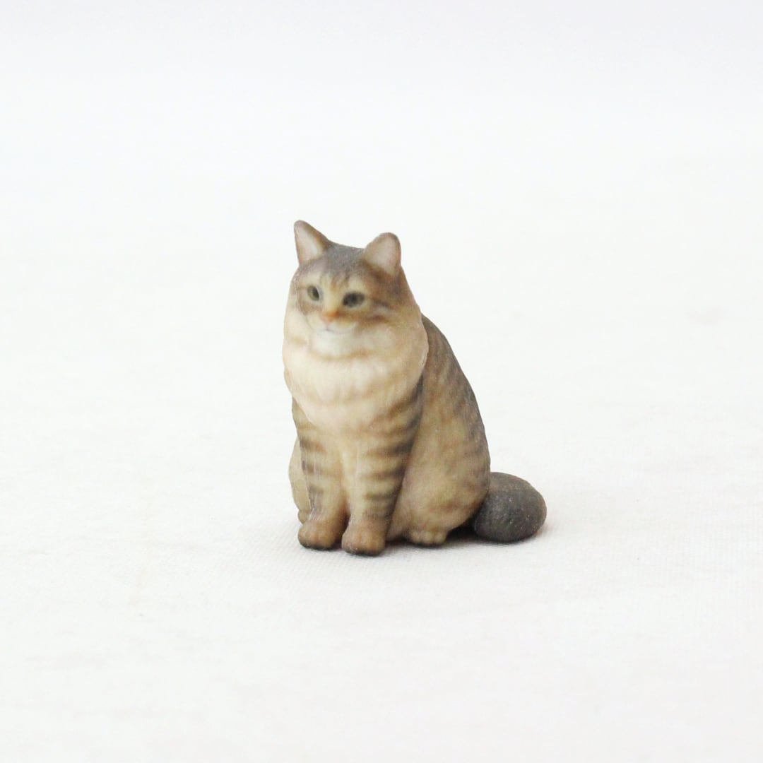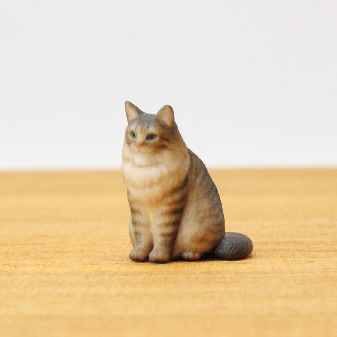 首周りをぐるりと囲む豊かなファーのような毛並みやブラウンタビーの複雑な色の重なりが見やすいよう、ちょこんとおすわりしている姿でお作りしました。