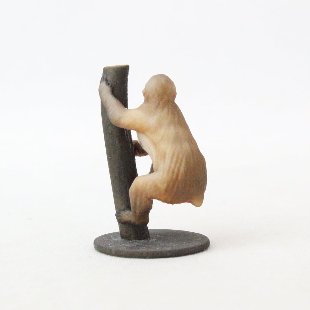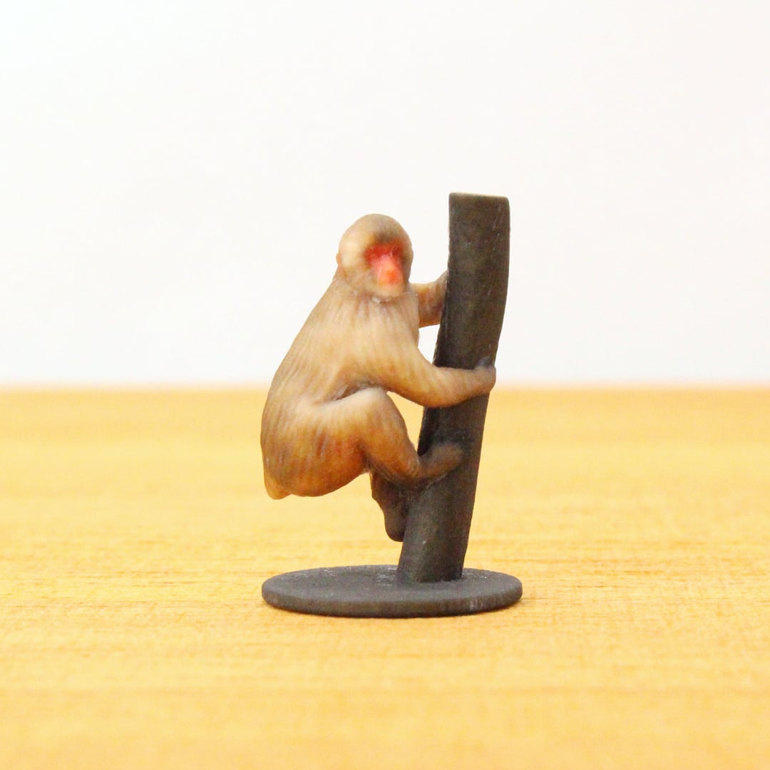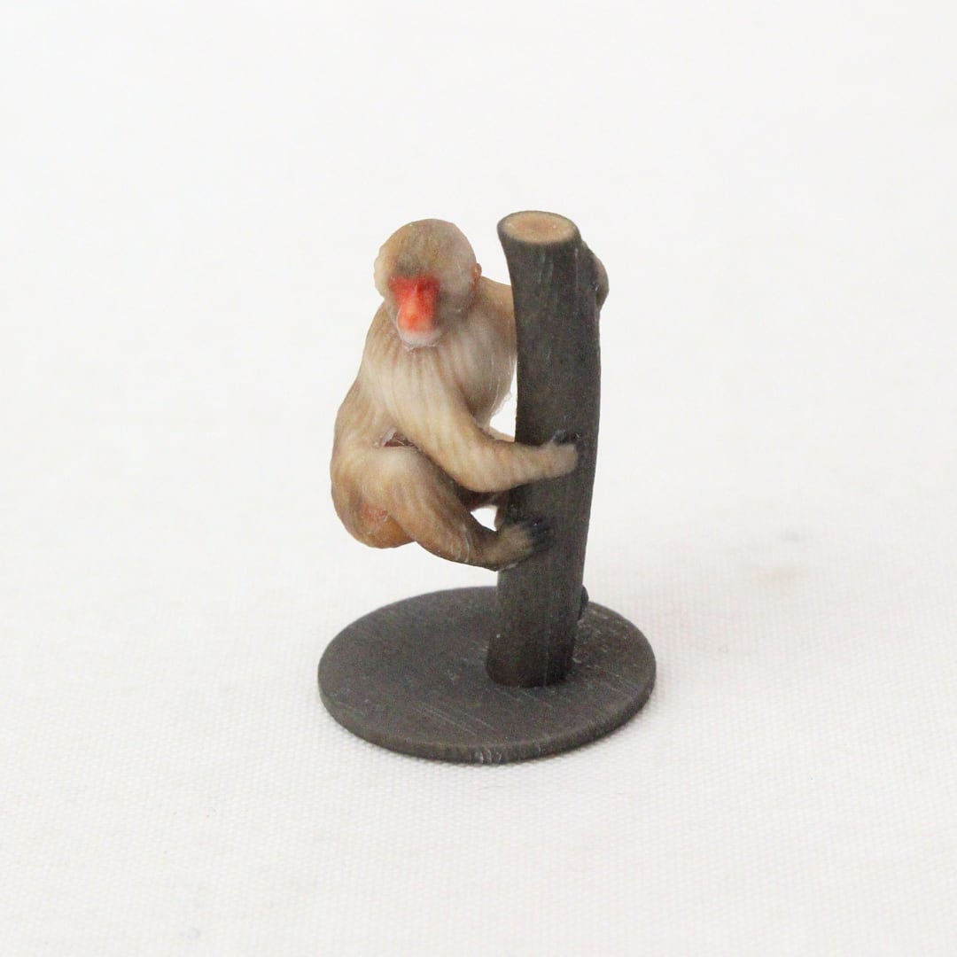 ふっくらとした赤ら顔に、厚みのある冬毛を思わせる柔らかな毛並み、そのがっしりした体格で木に登る様子を再現いたしました。